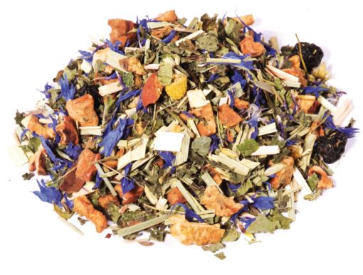 Pomme*, Citronnelle*, Fenouil*, Carvi*, Mélisse*, écorces de Cacao*, Camomille*, Aronia*, Tulsi*, Echinacée pourpre*, fleurs de Bleuet* *Issu de l’agriculture biologique